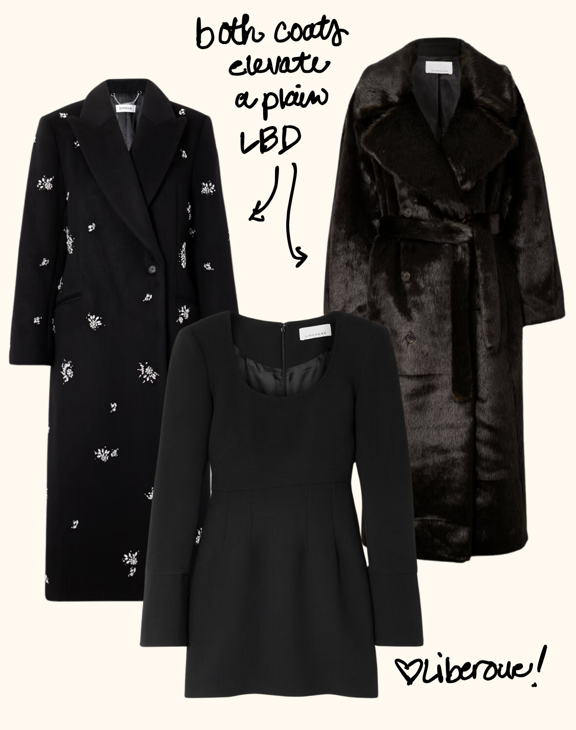 If your party requires outdoor time, try a coat with something extra, like a fuzzy fabrication or a touch of sparkle. Slip it on over that trusty LBD that makes you feel great, and punch it up with statement-making accessories.