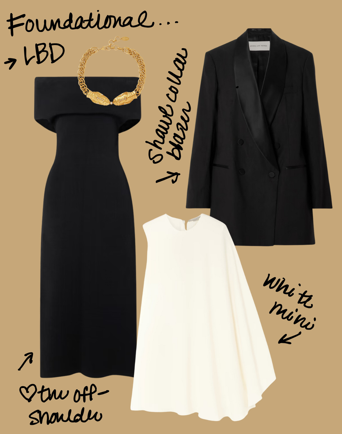 Me? I’m relying on a black silk blazer by The Row to ground my party outfits this month — it looks great worn with jeans or trousers, thrown over a dress, or styled with shorts and tights.