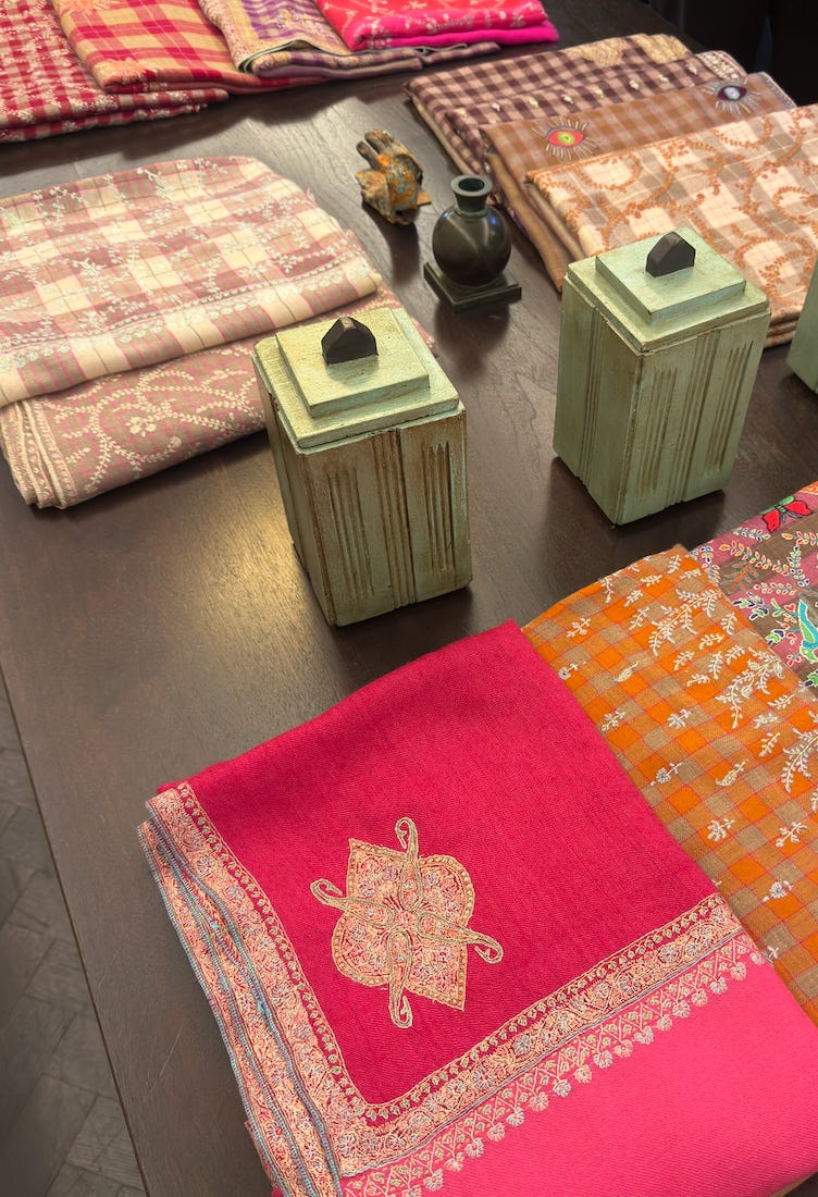 We were there to see Yaser Shaw, in town for only a few days for a tiny trunk show at Attersee. Shaw is a fifth-generation textile designer known for handcrafted Kashmiri cashmere shawls that blend old-world technique with more contemporary, graphic motif work. He does not have e-commerce. A single shawl can take up to two years to make. (You may have clocked his work in this photo of Jennifer Lawrence, or this photo of Mary-Kate Olsen.) I walked right into the WSJ’s Lane Florsheim who was chatting with Yaser and cooing over his work with the rest of us. (As Kaitlin Phillips pointed out, Shaw was recently in The New York Times spinning a yarn of his own.)
