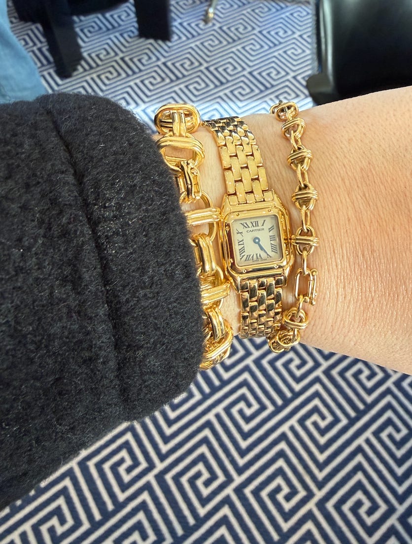 The final was a teeny tiny 18k gold original-era Cartier Panthère watch, which is what finally broke my will. It just looked too perfect with my existing jewelry, worn almost more as a bracelet than a watch, and felt very evenly weighted. The case back engraving confirmed its provenance; produced in Paris and not one of the later-outsourced, post-Richemont mass revival reissues. It is circa late 1980s to early–mid 1990s — so right when I was born, which means we are around the same age! It’s so special and feels like it has always been mine.
