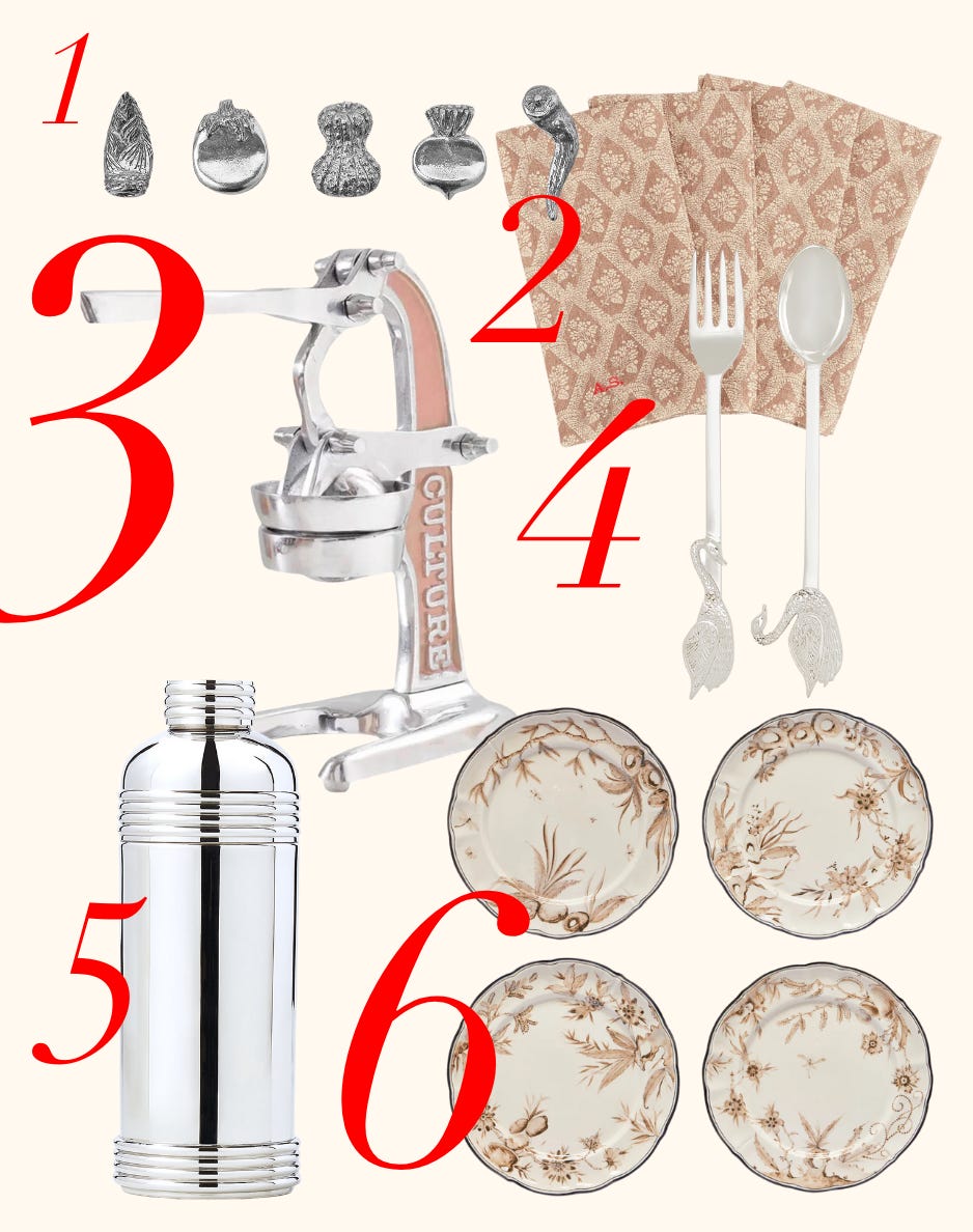 ABASK Kyoto vegetable chopstick rests (looks good with Sabre chopsticks) 2. Autumn Sonata napkins 3. Verve Culture small countertop juicer (so cute, I want one) 4. Moda Domus swan silver-plated serving pair 5. Ralph Lauren cocktail shaker 6. Laboratorio Paravicini Rocaille ceramic set of four dinner plates