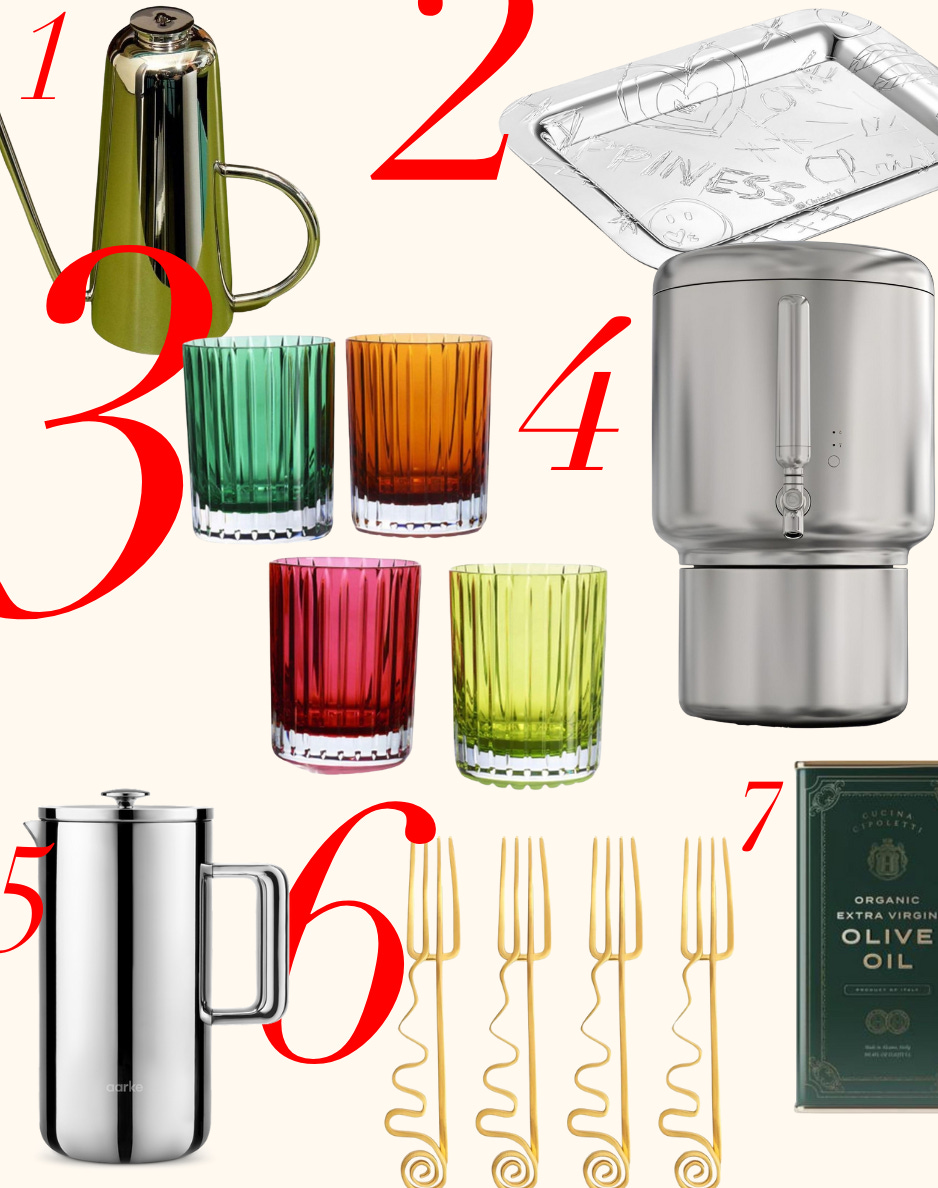 Holcomb Studio dripless oil can 2. Christofle small graffiti tray (also coveting the brand’s flatware collaboration with Charlotte Chesnais) 3. Baccarat Harmonie tumblers 4. Rorra countertop water filter 5. Aarke hot water kettle 6. L’OBJET Spirale flatware 7. Cucina Cipoletti organic extra virgin olive oil