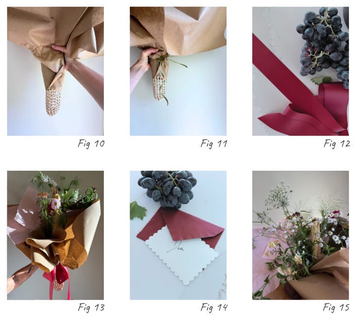 Add the two flower arrangements while holding the baguette and paper upright (don’t arrange it on a surface, because the water will spill). Wrap the paper at the bottom only, as shown in Fig. 10, creating a paper coup. Secure the paper, basket, and arrangements together with twine or string tightly, as shown in Fig. 11.
