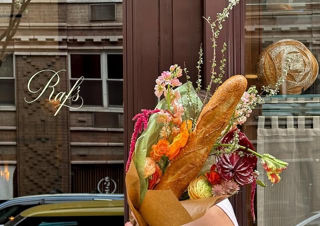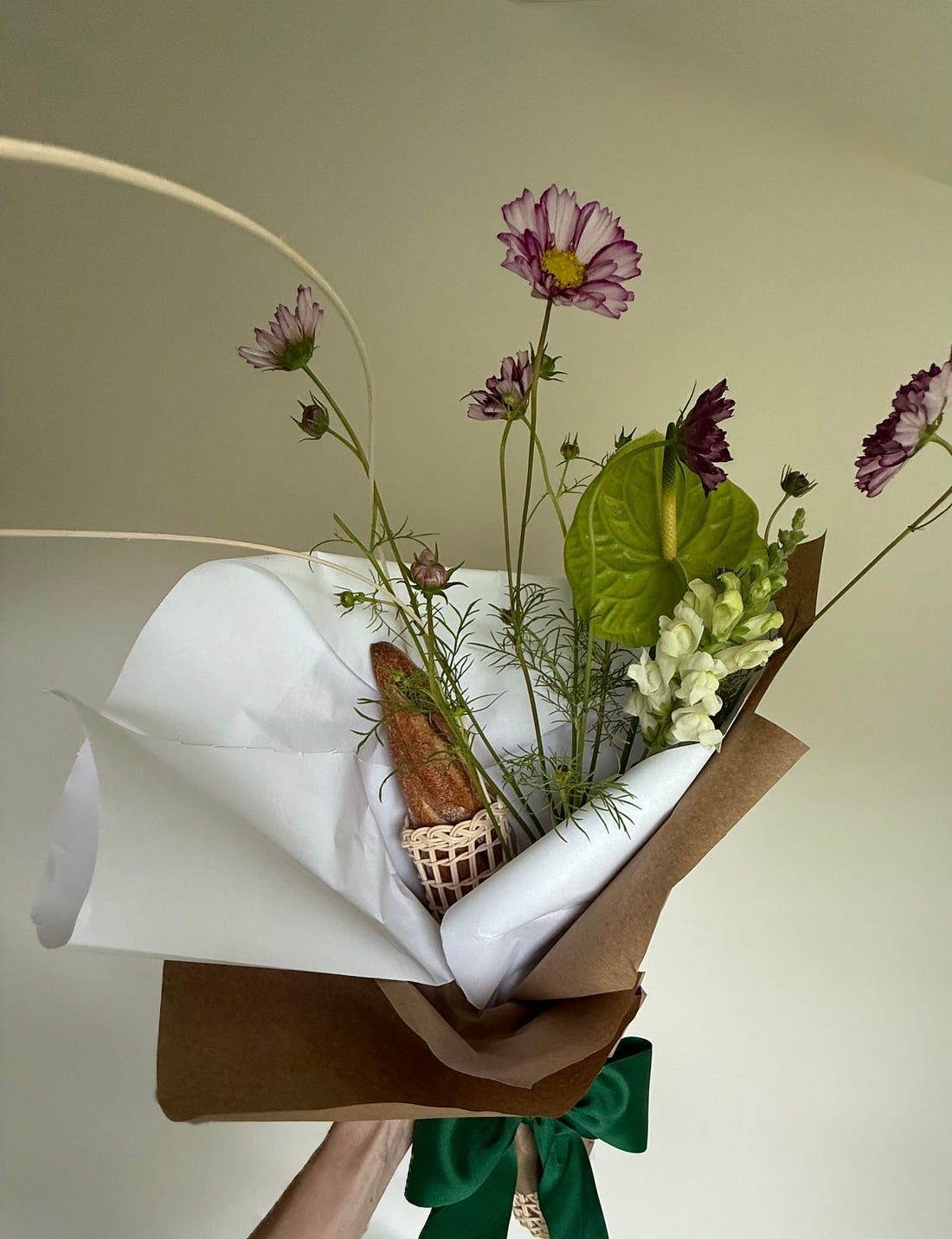 .)I’d seen my friends at Raf’s do a super clever “boulé bouquet” for Mother’s Day, with a fresh-baked baguette tucked into a paper-wrapped flower bouquet. (Yes, I know that technically, a boulé is round, but let us have the pun, okay?) And I knew Erin made cheeky baskets for baguettes, so I thought it would be fun to combine the ideas.