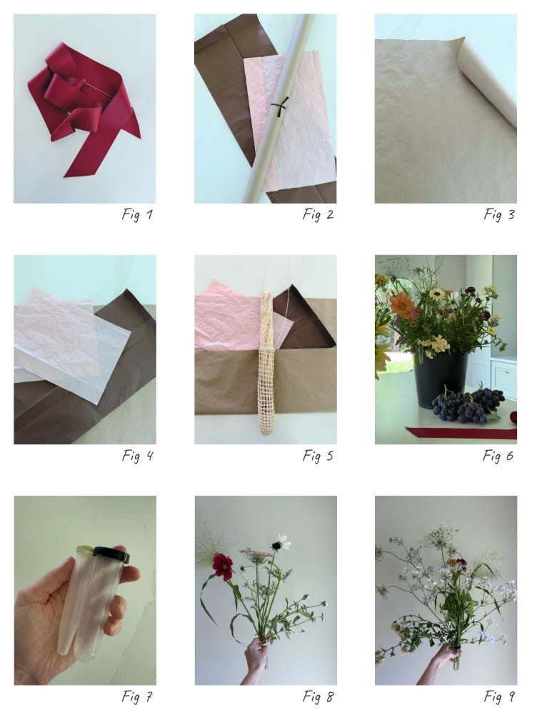 To create a Baguette Basket Bouquet, first decide on a color palette for your ribbon and paper materials. For this tutorial, I’ve chosen a 3" wide burgundy ribbon and paired it with blush tissue. I use brown recycled wrapping paper and kraft paper, as shown in Figs. 1-2. For a sophisticated look, the ribbon can be cut at an angle. You’ll be approximately 4 feet in length. The kraft should be at least 3' long x 4' wide for a high-impact bouquet as per Figures 3 and 4. Fold the Kraft in half so that it is 3 x 2’. Stack the papers at various angles on your surface, as shown in Fig. 4.