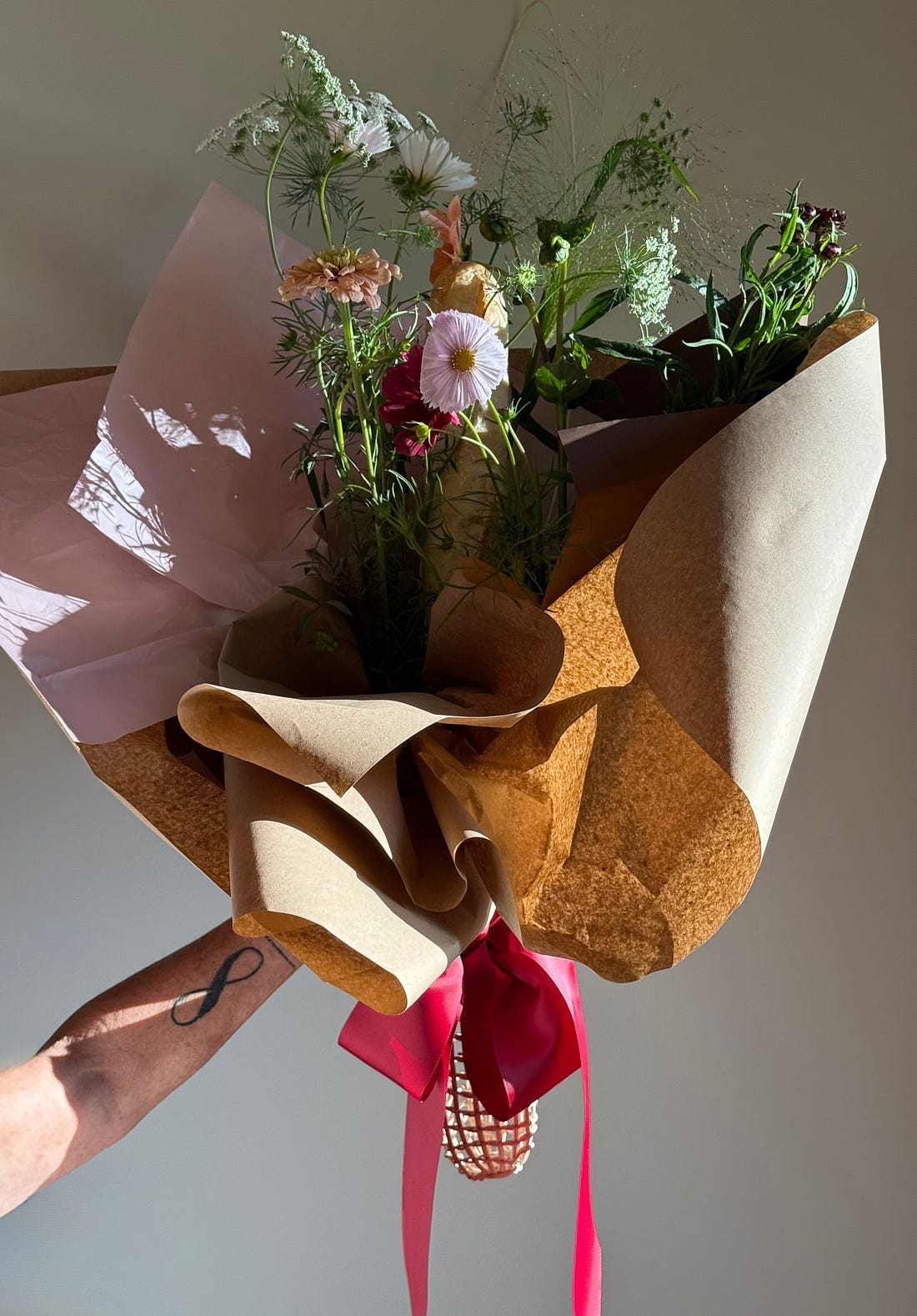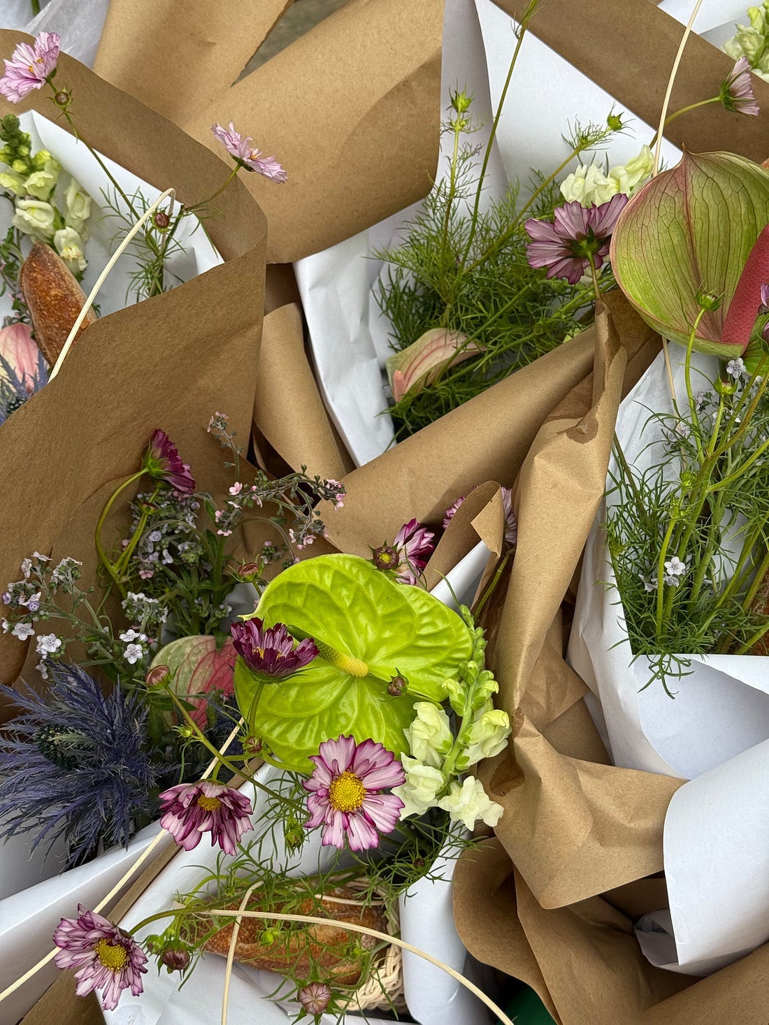 When Jess told me she was “off the market,” I knew what to do: Create a market basket bouquet of epic proportions. For a dinner to celebrate, Underwater Weaving Studio delivered Woven baguettes wrapped with farmers’ market flowers and fresh-baked bread for the bride-to-be and guests. We loved making them together, so we’re sharing the components you need to gather friends and make them at home.