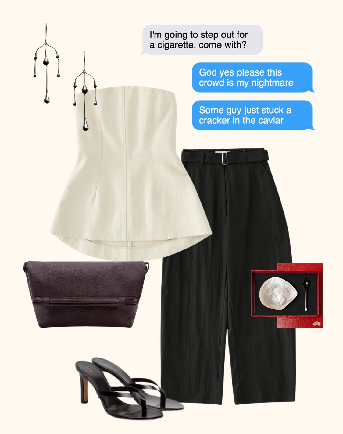» Sophie Buhai earrings // Studio Nicholson top and pants // Janessa Leone clutch // Gohar world caviar set // The Row sandals