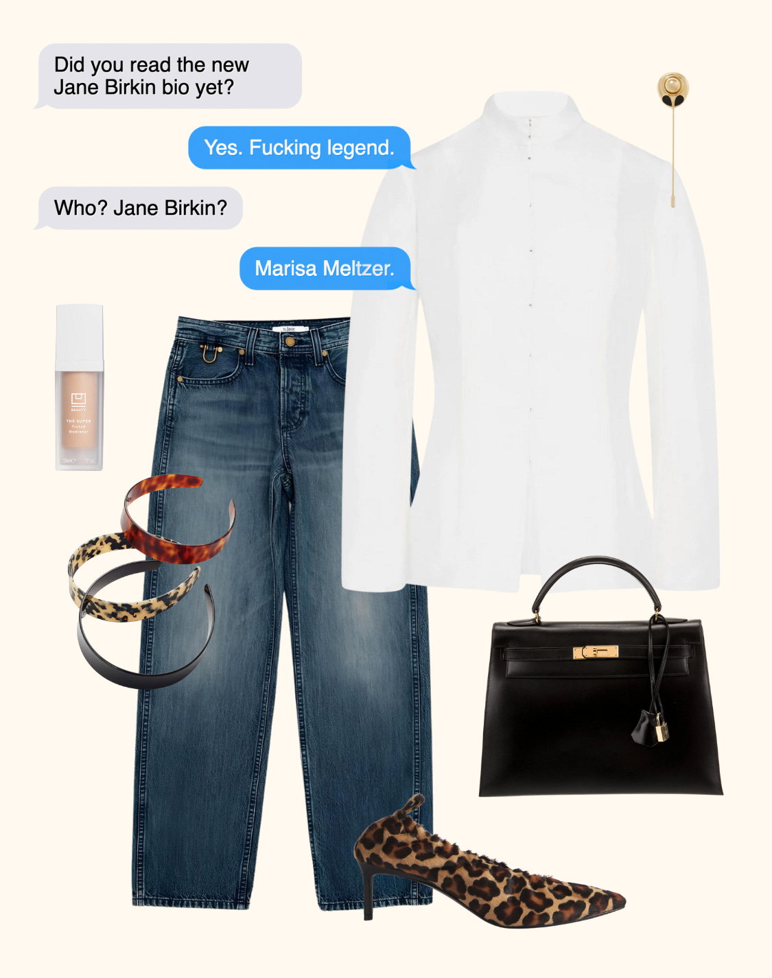 » Colleen Allen shirt // The Only Jane denim // Sophie Buhai headbands // CO heels // Gigi Burris pin // U Beauty tinted moisturizer // vintage Kelly 32 // Jane Birkin: IT Girl by Marisa Meltzer