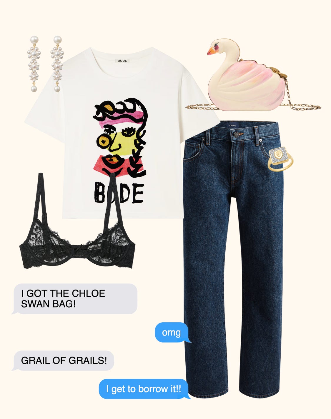 » Sophie Bille Brahe earrings // Bode t-shirt // Chloé bag // Khaite jeans // Eriness zodiac ring // Fleur du Mal bra