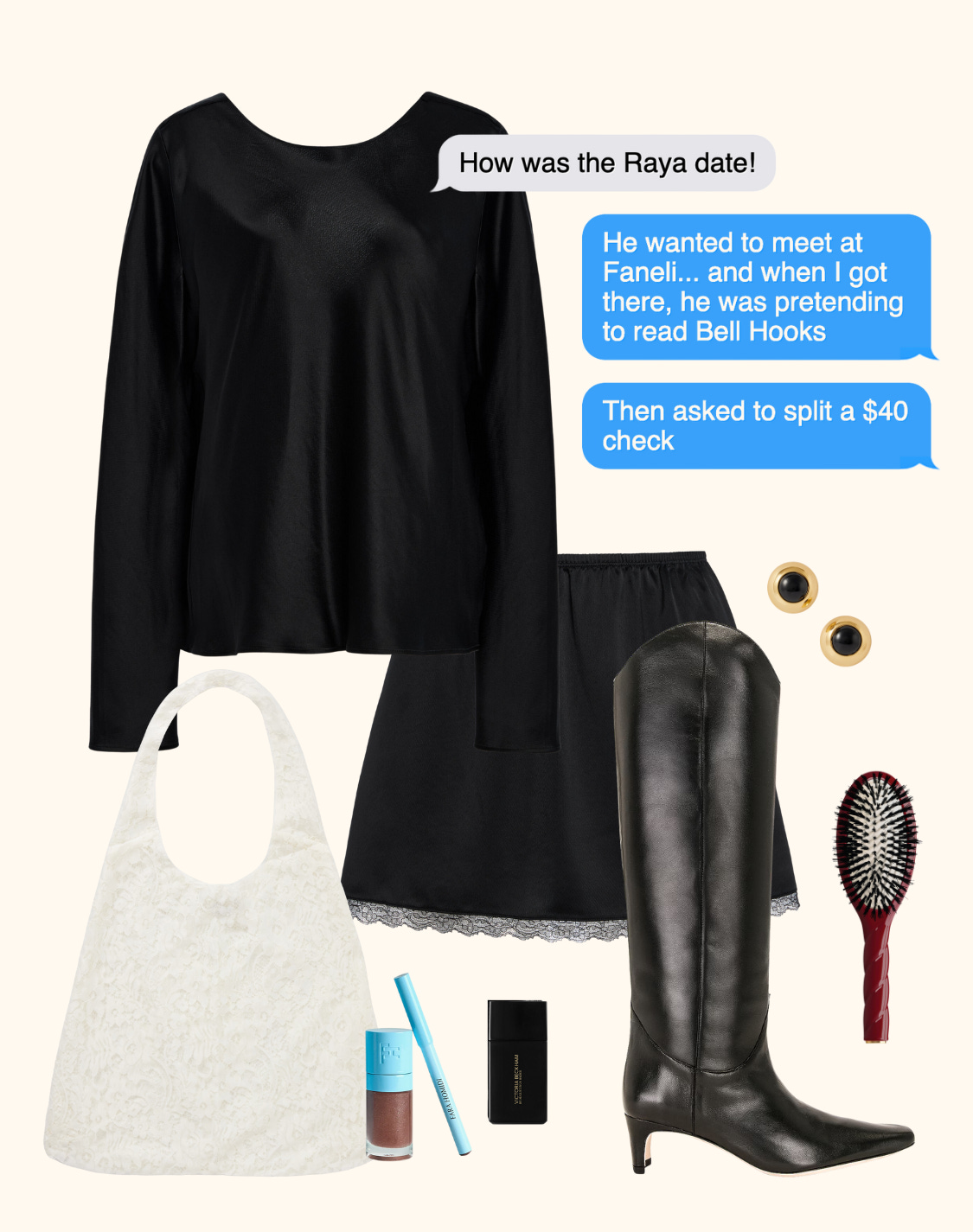 » LESET top and skirt // Gohar World lace bag // Staud boots // Farah Homidi gloss and liner set // La Bonne Brosse brush // Lié Studio earrings // Victoria Beckham foundation drops