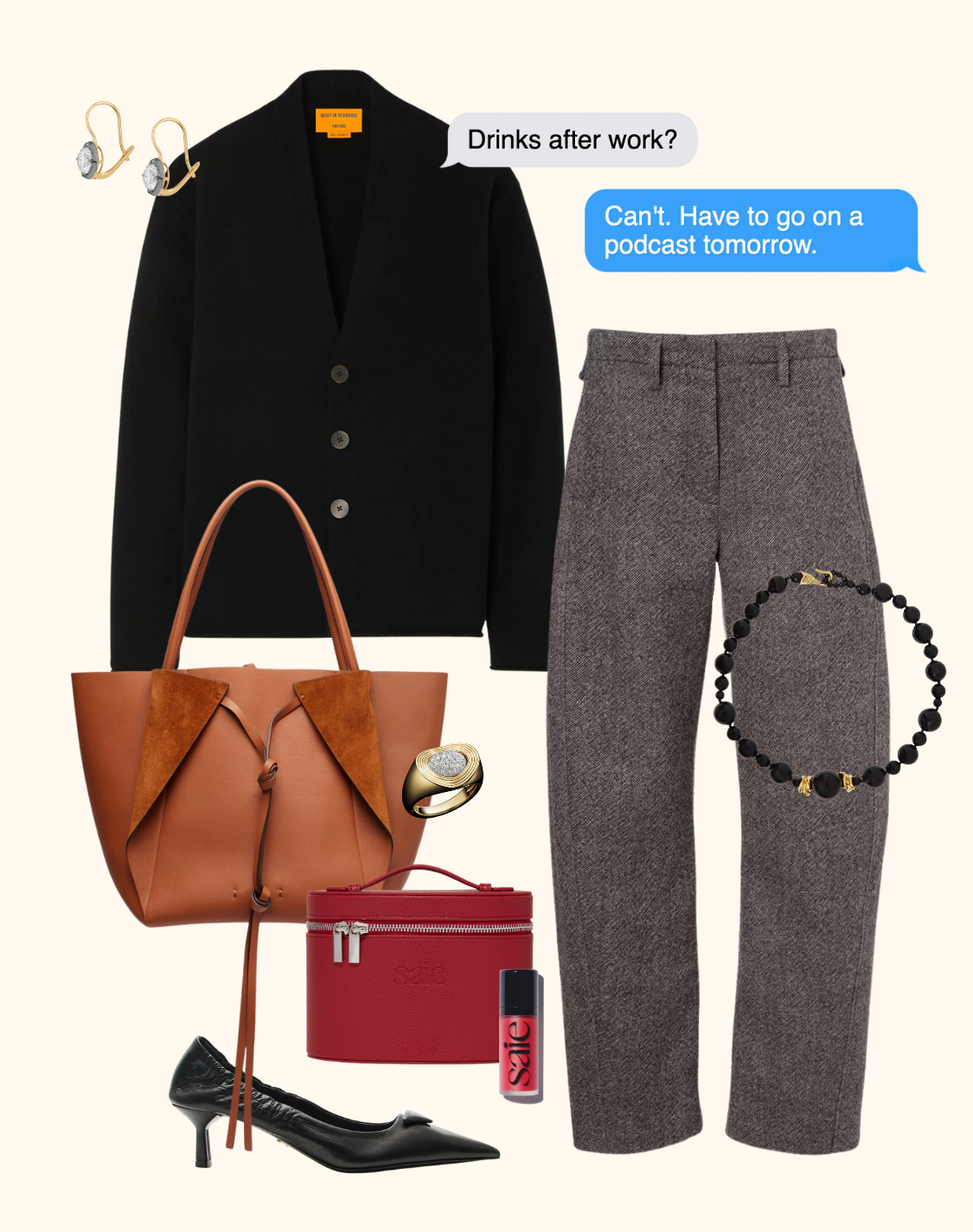 » Dorsey earrings // Guest in Residence cardigan // Gabriela Hearst bag // Magda Butrym trousers // EREDE ring // Anita Berisha necklace // Saie blush and vanity case // Prada pumps