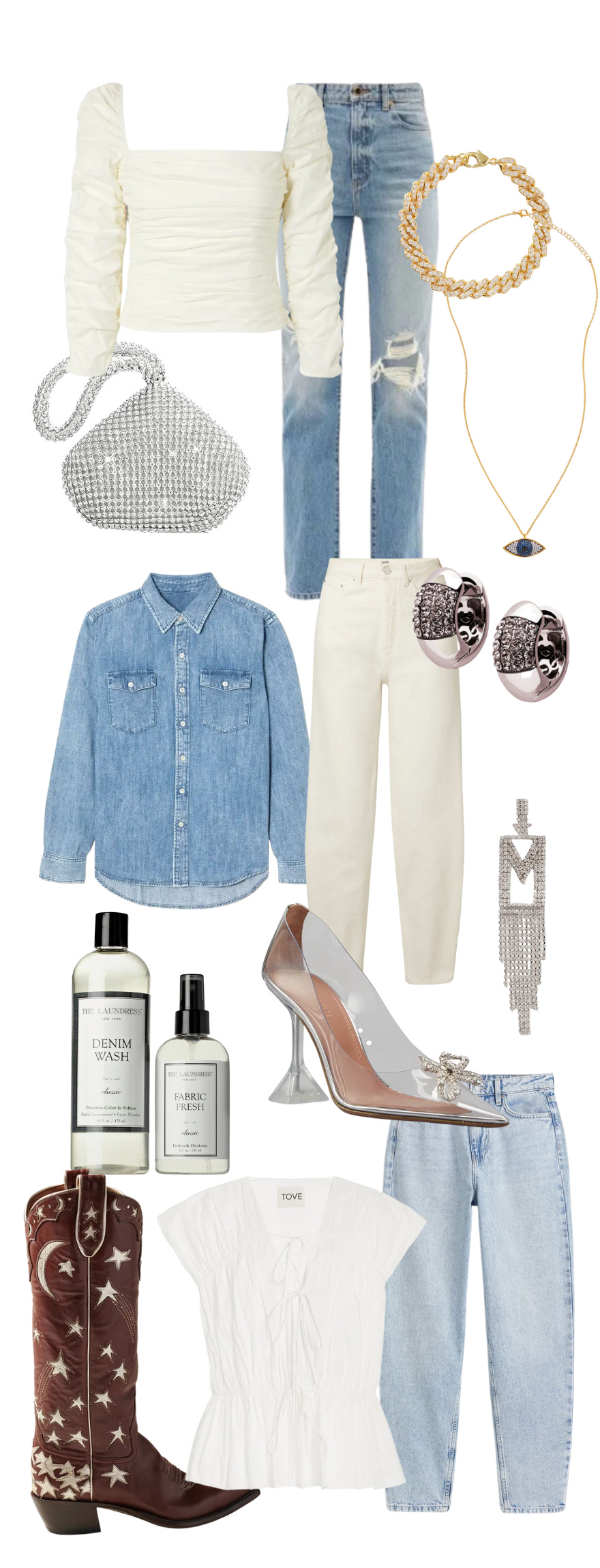 Reformation Joi top / Khaite Danielle jeans / Crystal Haze CZ bracelet / Begum Khan evil eye necklace / Amazon wristlet bag / Wardrobe.NYC denim top / Toteme jeans / Dorsey Lucette earring / The Laundress denim care set / Amina Muaddi heels / Retrofete Alphabet crystal earrings / Miron Crosby Margretta boots / Tove Thea top / H&M loose jeans / More product details here.
