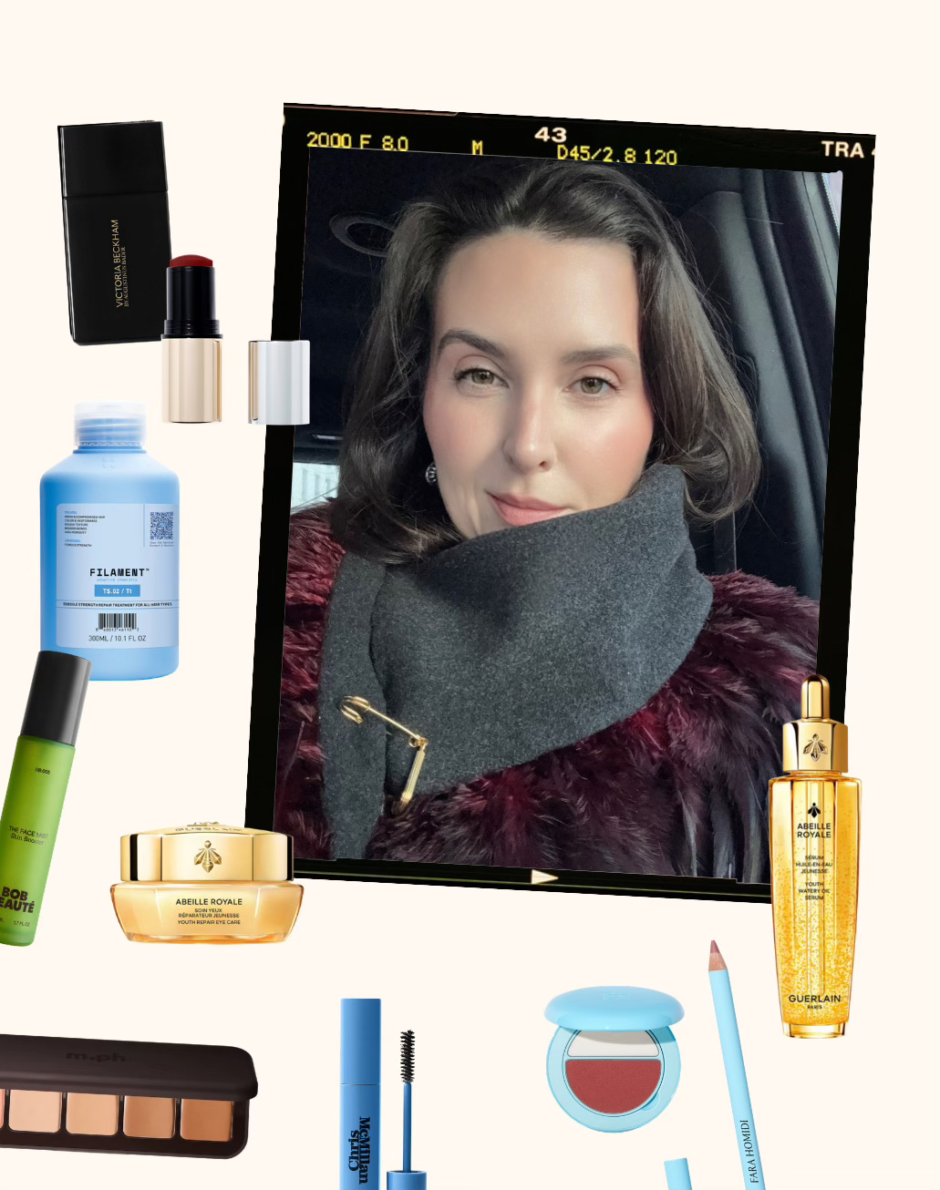 MAKE Beauty’s Cream Blush (shade: BASK) gives that just-in-from-the-cold flush that still reads at dinner, and I lock it in with a light sweep of Laura Mercier Ultra Blur Setting Powder only where I crease. Brows get brushed up with MAKE Beauty Eyebrow Gel, lashes coated in Victoria Beckham Beauty Vast Lash Mascara so they hold their lift, and a mist of Saie Cityset to help everything stay in place.