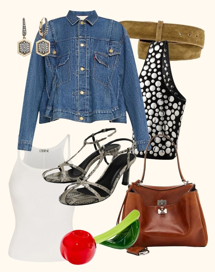 Links: Edie Parker cherry pipe, Balenciaga small Rodeo bag, Sacai x Levi’s jacket, Eterne tank, Khaite studded suede tote, Massimo Dutti sandals, Kemo Sabe belt.