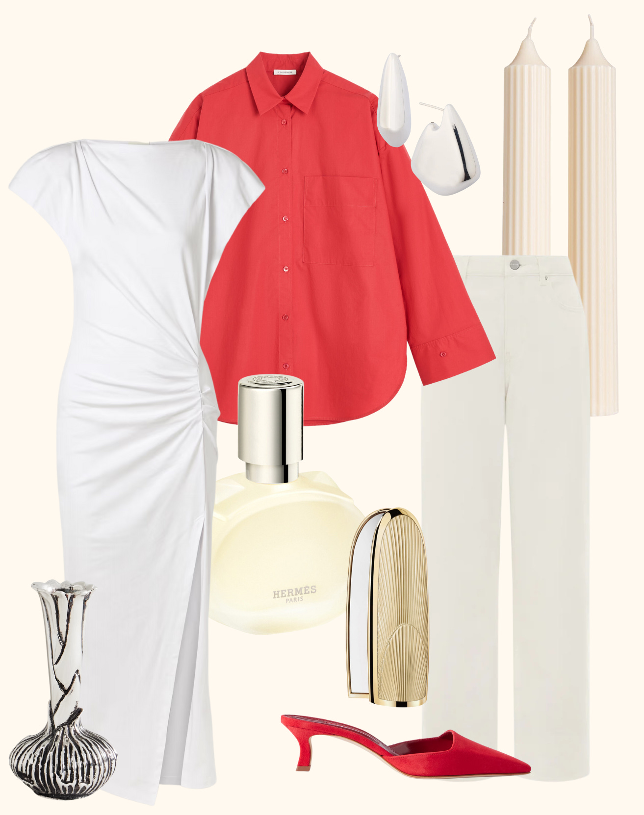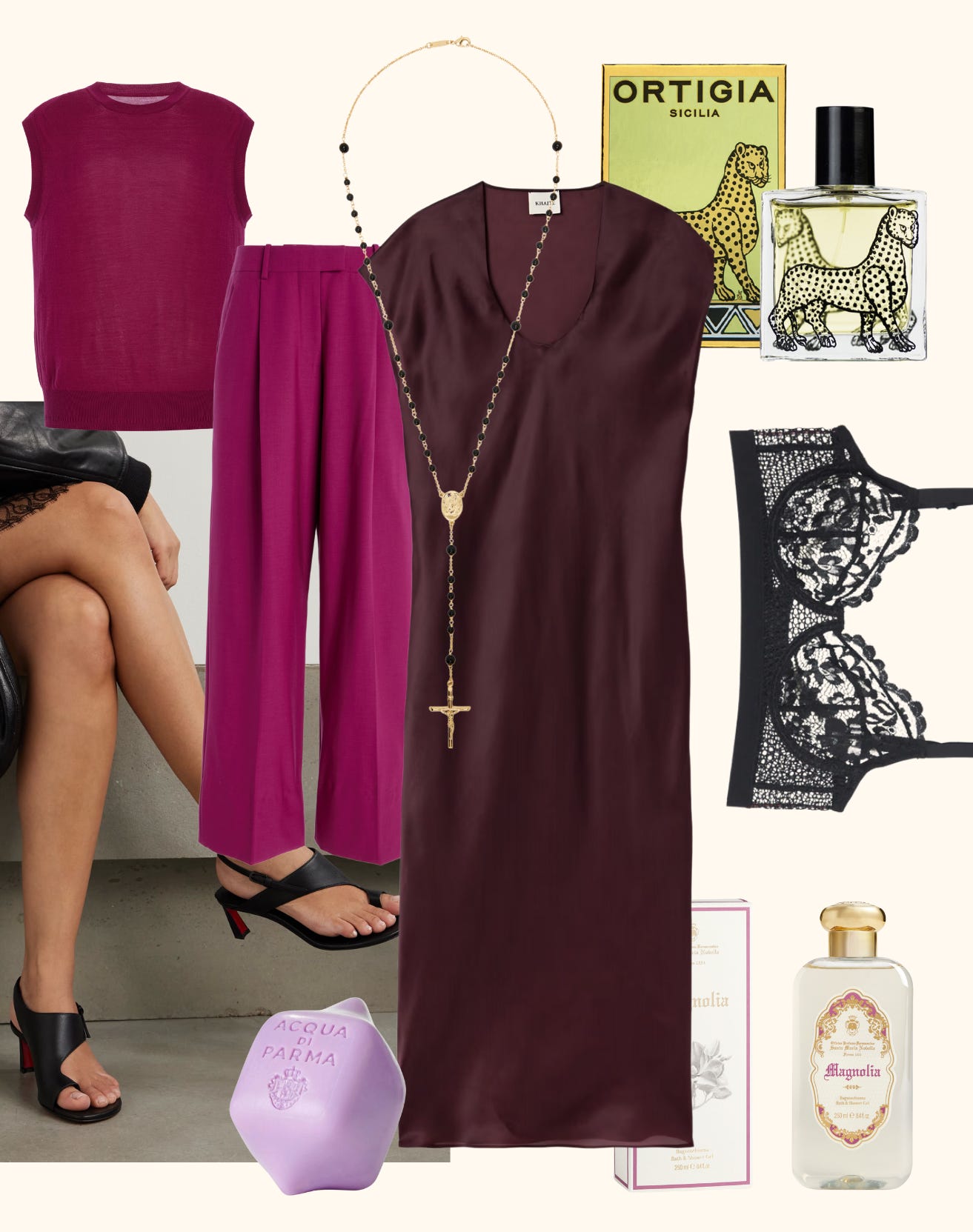 Links: Another Tomorrow top and pants, Dolce and Gabbana rosary, Ortigia perfume, Else Lingerie underwire bra, Khaite silk dress, Santa Maria Novella Magnolia bath gel, Christian Louboutin shoes, Acqua di Parma perfume