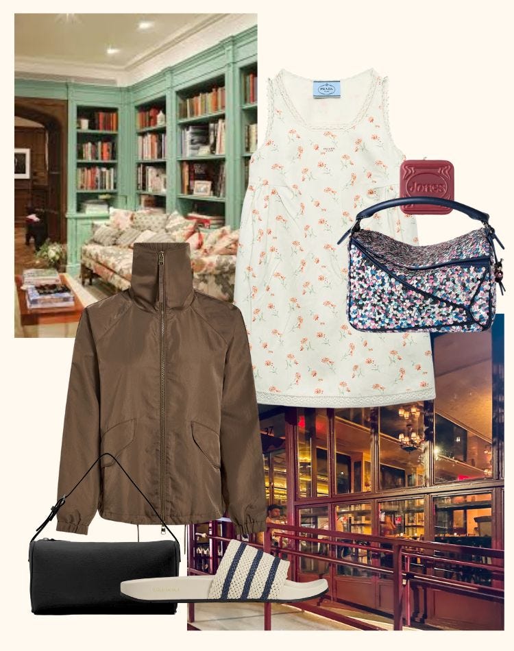 Links: Varley jacket, Jones Cherry Mints, Prada babydoll dress, The Row 90’s bag, Wales Bonner Adilette slides, Loewe 10th anniversary Puzzle bag.