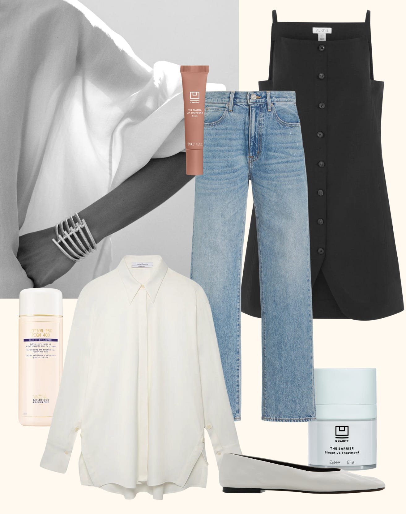 Links: Alaia small Le Click bag, dedCooL Aura fragrance, L’Occitane shimmering almond body oil, Aflalo Lolana silk pant, Sidia Wired body serum, Ben Amun bangles, Chanel Sublimage Le Masque.
