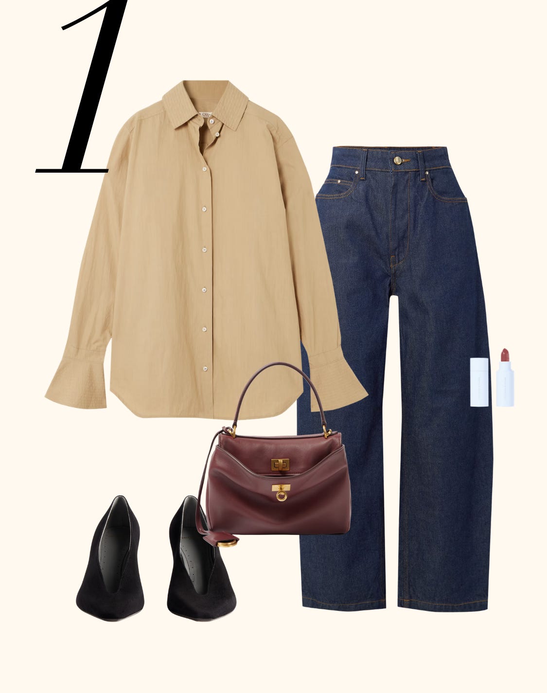 1: OSSOU shirt and denim, Balenciaga bag and shoes, Westman Atelier lipstick