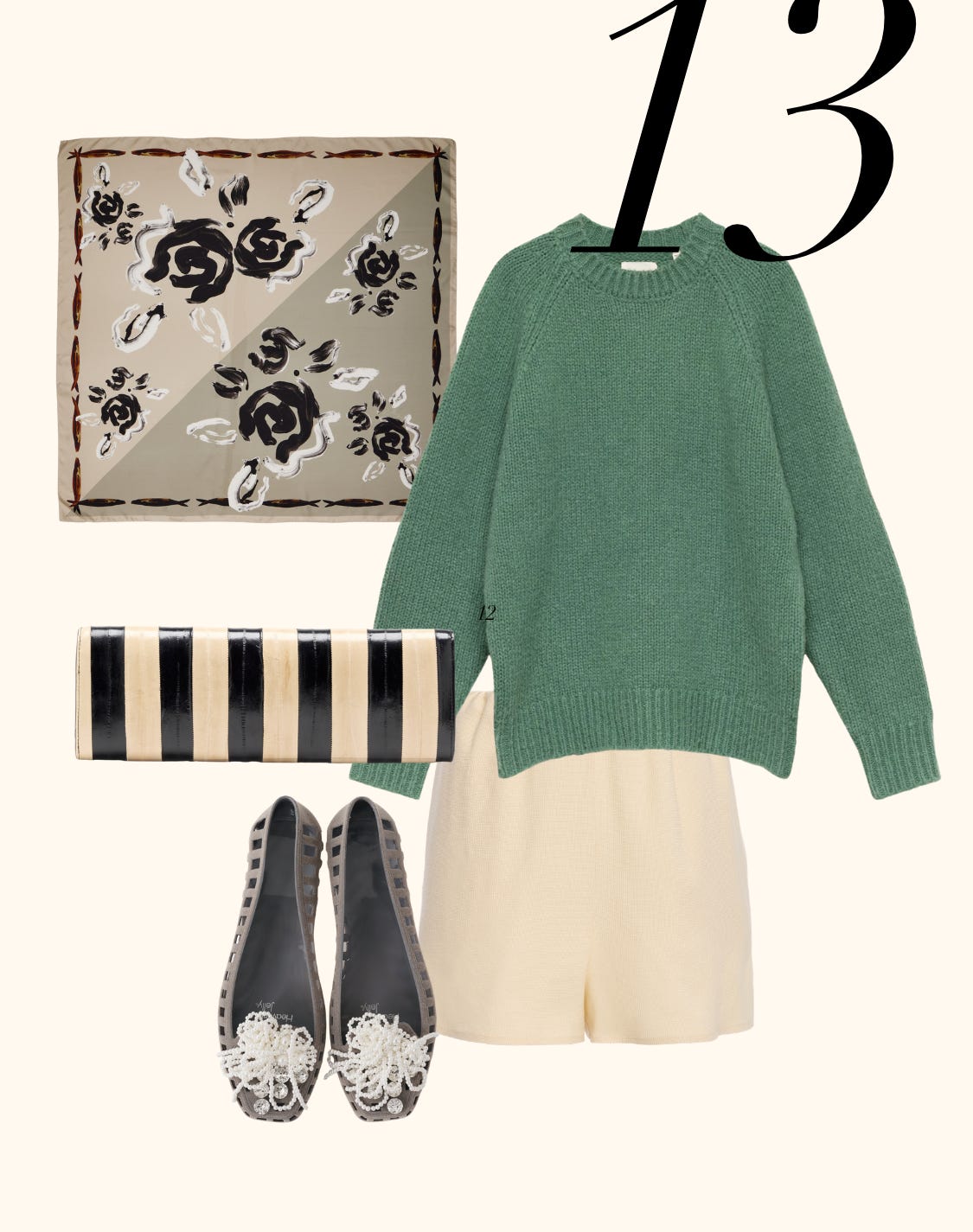 13: Kallmeyer scarf and shorts, Doen sweater, Proenza Schouler bag, Heavenly Jelly jellies