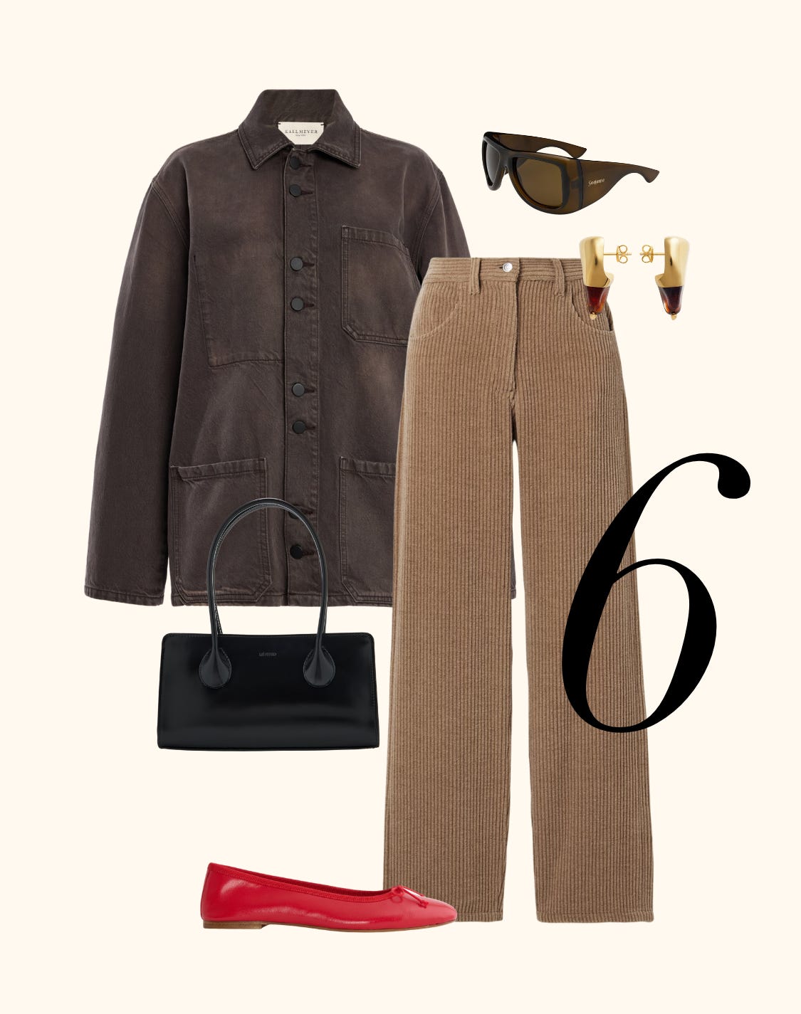 6: Kallmeyer jacket, The Row pants, Saint Laurent sunglasses, Bottega Veneta earrings, LIE Studio bag, Alex Mill flats
