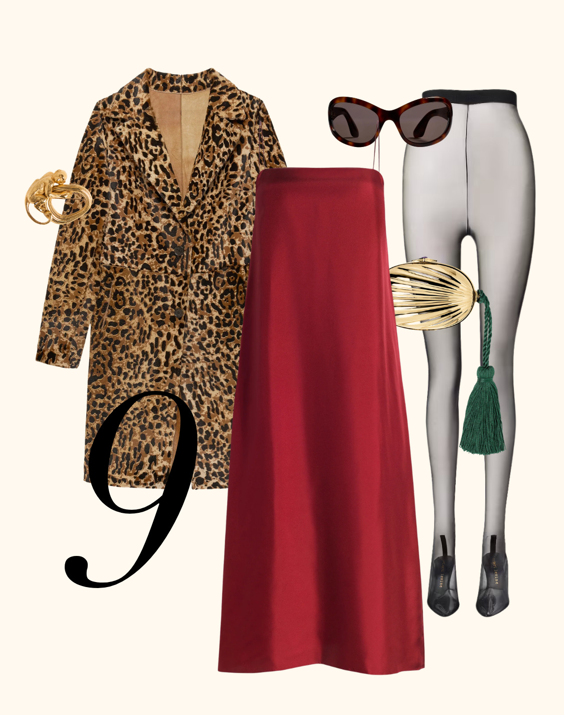 9: Khaite brooch, Mietta coat, Comme Si slip dress, Juju Vera clutch, Herbert Levine hosiery boots, Khaite x Oliver Peoples sunglasses