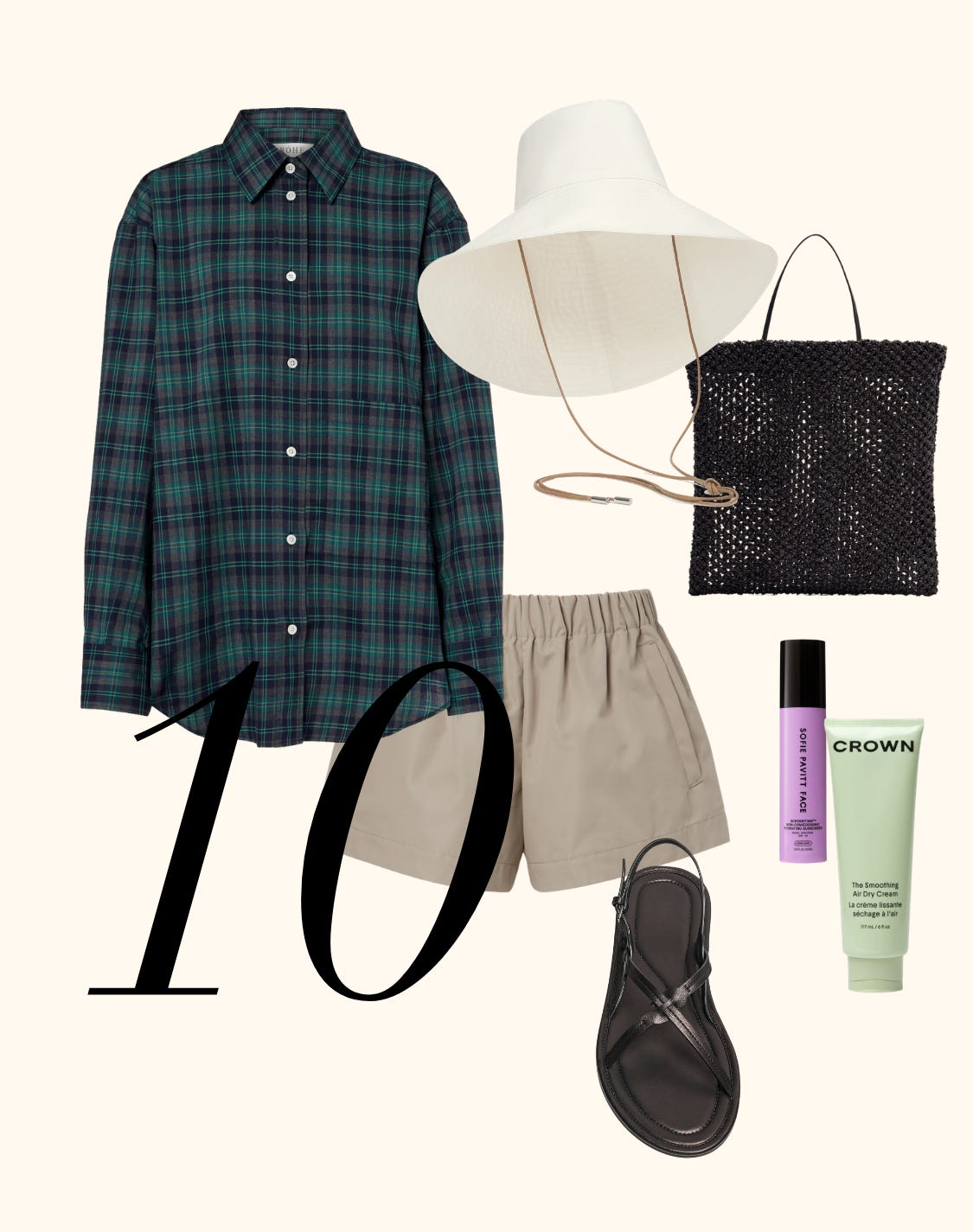 10: Rohe shirt, Wardrobe.nyc shorts, TWP x Gigi Burris hat, The Row bag and sandals, Sofie Pavitt sunscreen (THELOVELIST15), Crown Affair Air Dry Cream (THELOVELIST)