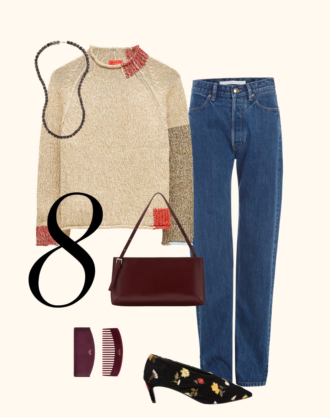 8: Le Sundial necklace, Eckhaus Latta for J.Crew sweater, RUADH jeans, St. Agni bag, Celine comb, Khaite pumps
