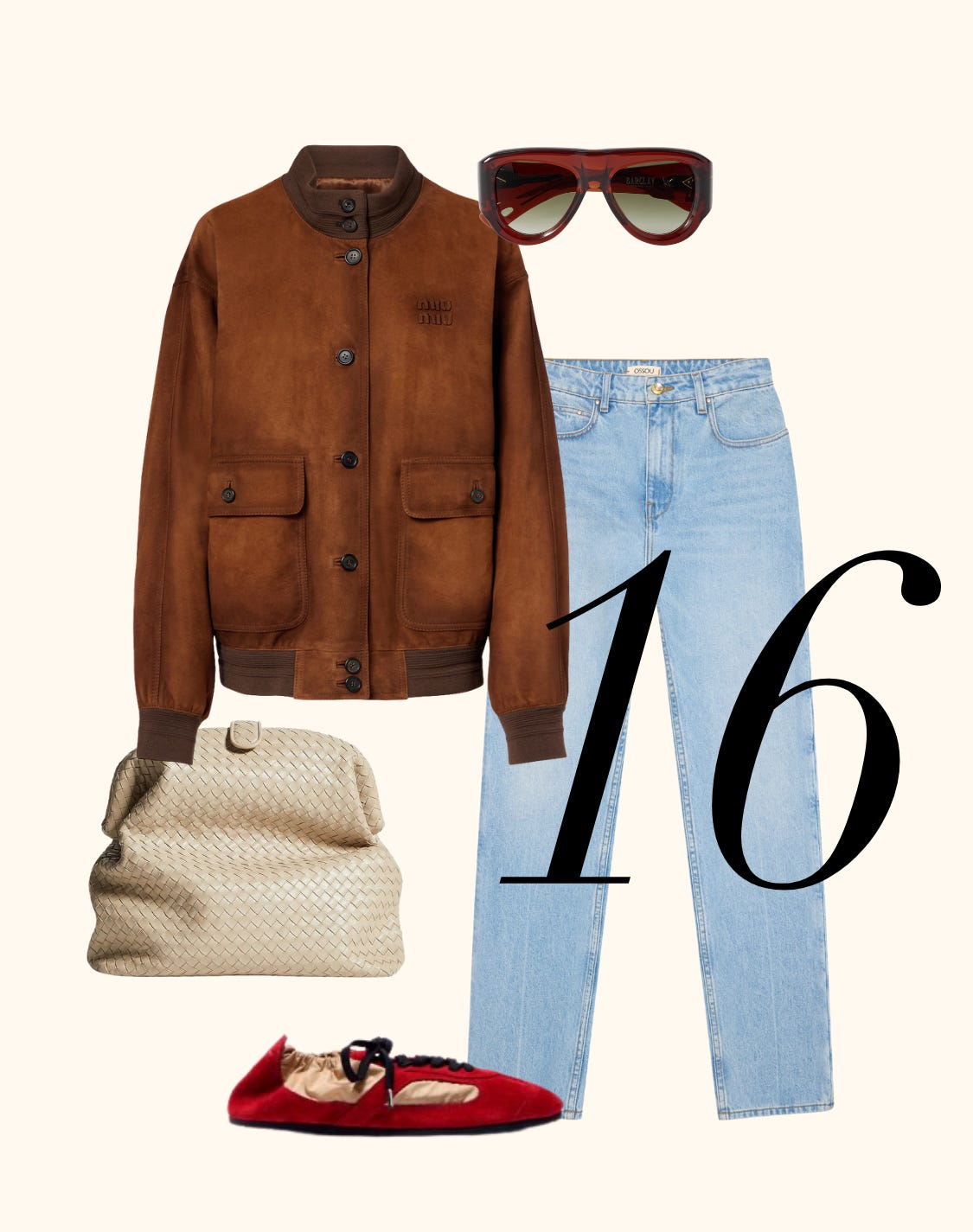16: Jacques Marie Mage sunglasses, Miu Miu bomber, OSSOU jeans, Bottega Veneta bag, Proenza Schouler sneakerinas