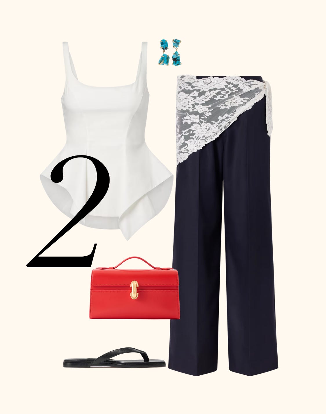 2: Lisa Eisner earrings, Khaite top, SEA NY pants, Savette bag, Emme Parsons sandals