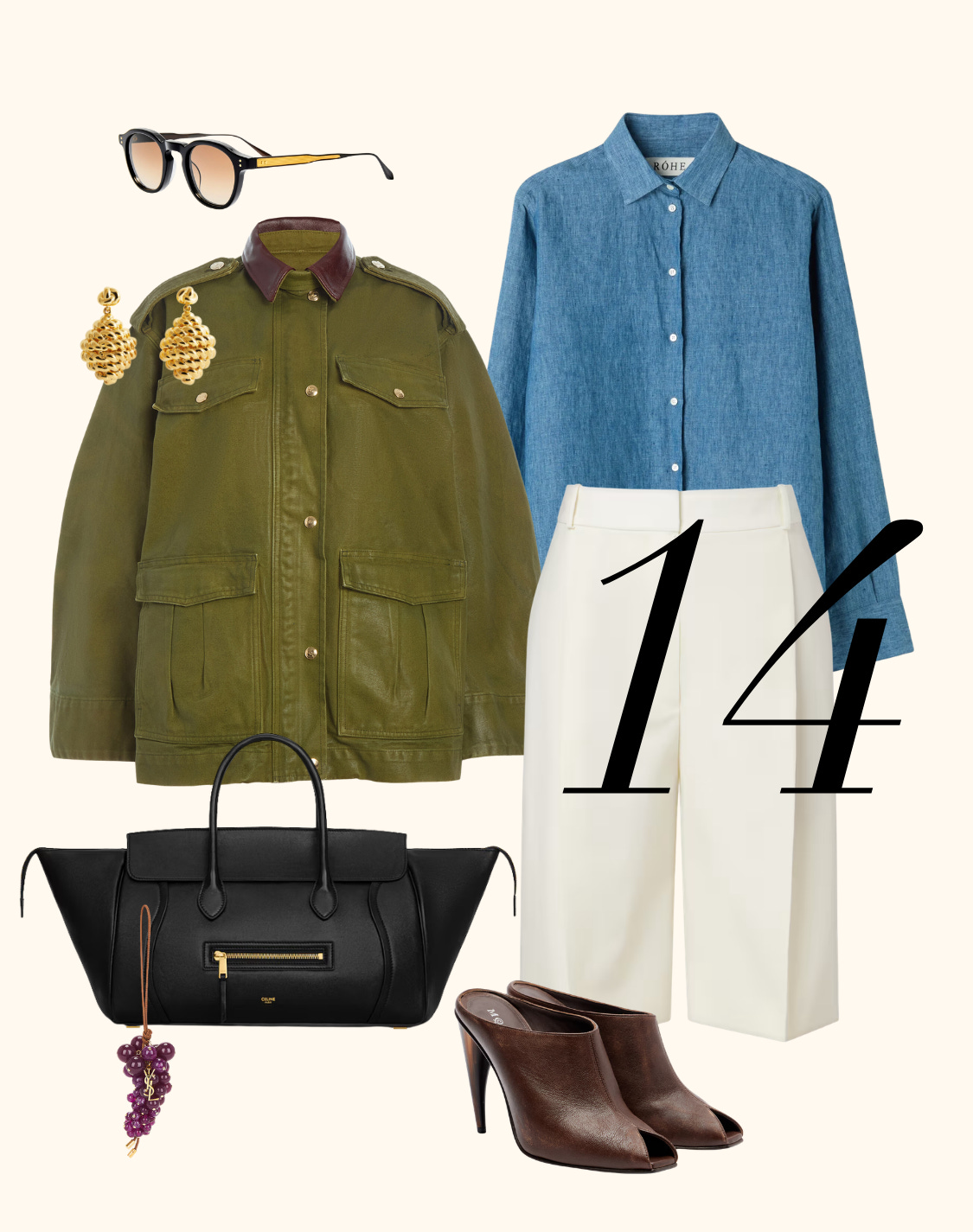 13: Linda Farrow sunglasses, RUADH jacket (alt), Toteme earrings, Rohe shirt and shorts, Celine bag, Saint Laurent bag charm, McQueen pumps