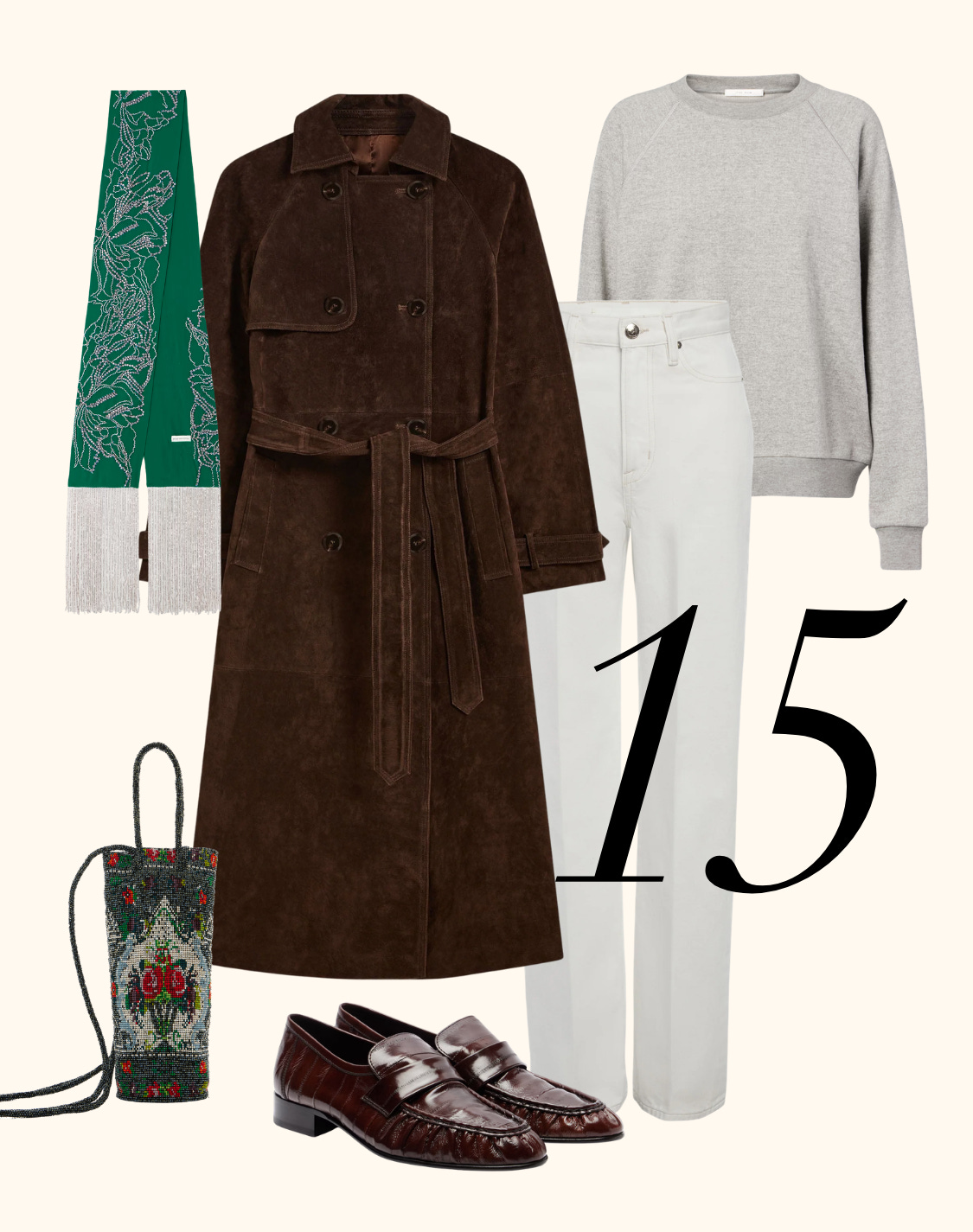 14: Dries van Noten scarf, Rise and Fall trench, Ruadh jeans, The Row sweatshirt, Cordera bag, The Row loafers