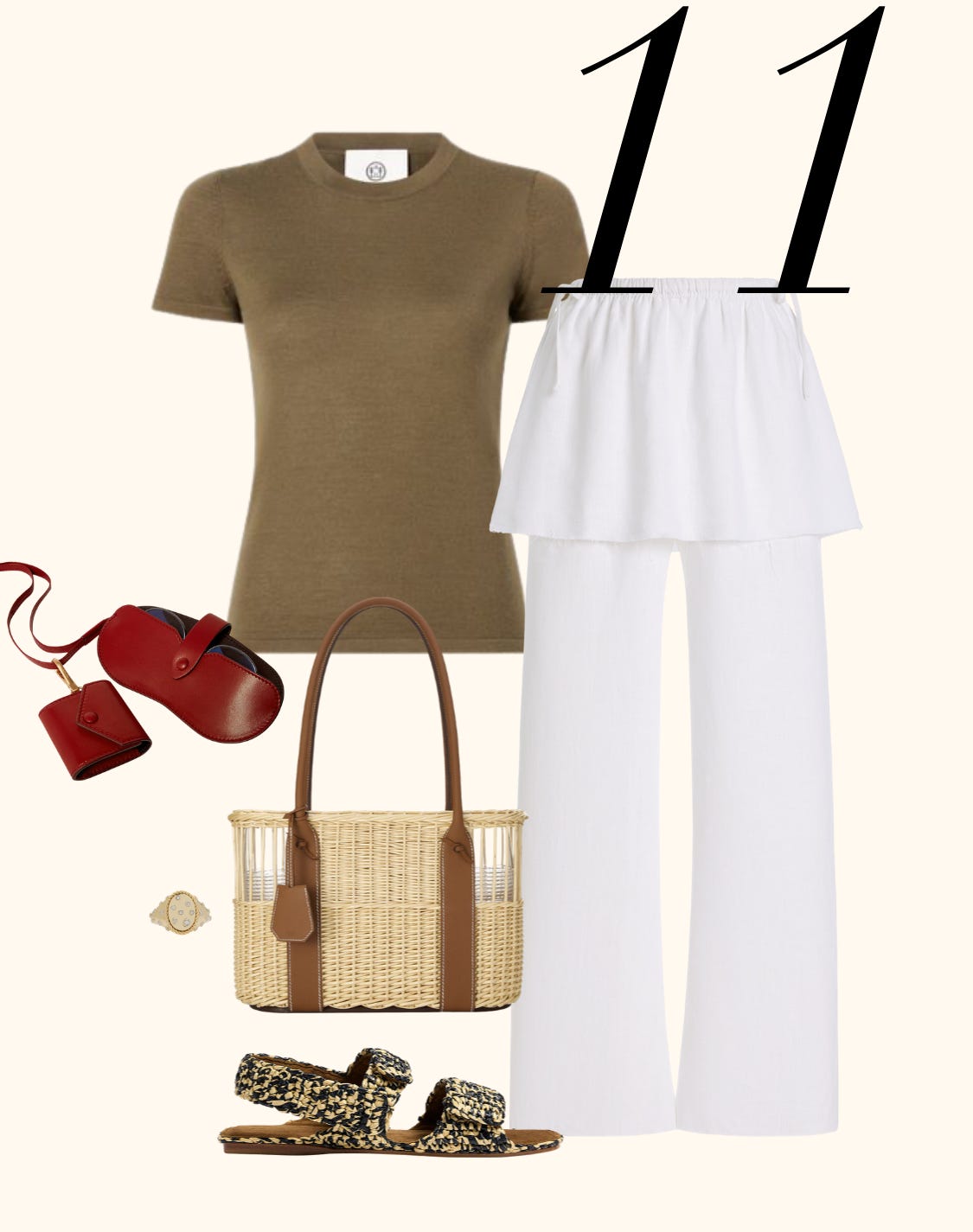 11: Attersee t-shirt, Mare Perpetua pants, Metiter sunglasses and earphones case, Hermes wine basket, Yvonne Leon signet ring, Khaite sandals