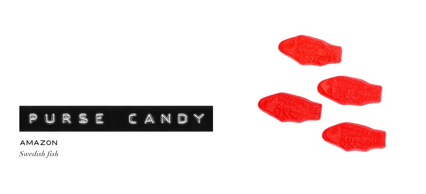 C+J: Purse snacks are by far the most crucial element of any handbag. We never, ever want to leave the house without at least two protein bars, a pack of almonds, and our personal favorites, purse tortillas (Clea) and Swedish Fish (Joanna).