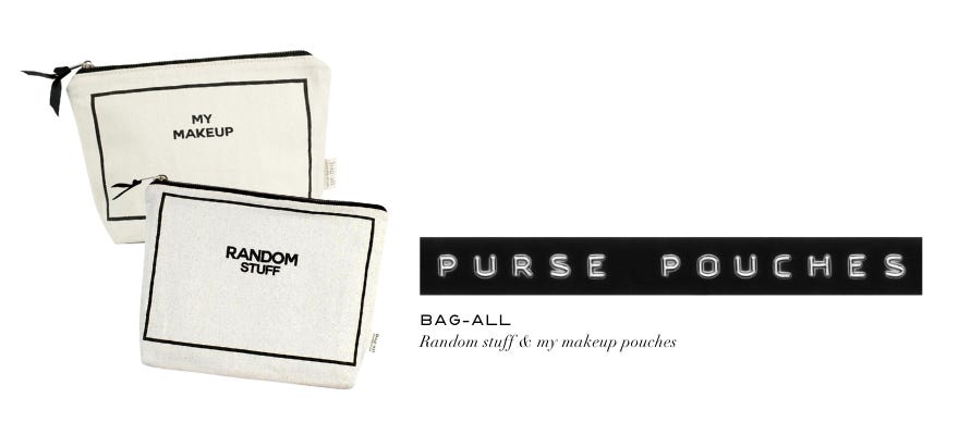 Clea + Joanna: Shortly after we started our company, we both went out and bought the same oversized Goyard tote and had them custom monogrammed. It’s become a part of our uniform, especially when we travel. But we also tend to switch out what bags we’re carrying depending on our mood. Storing everything in separate purse pouches allows us to swap without having to create a whole new system.