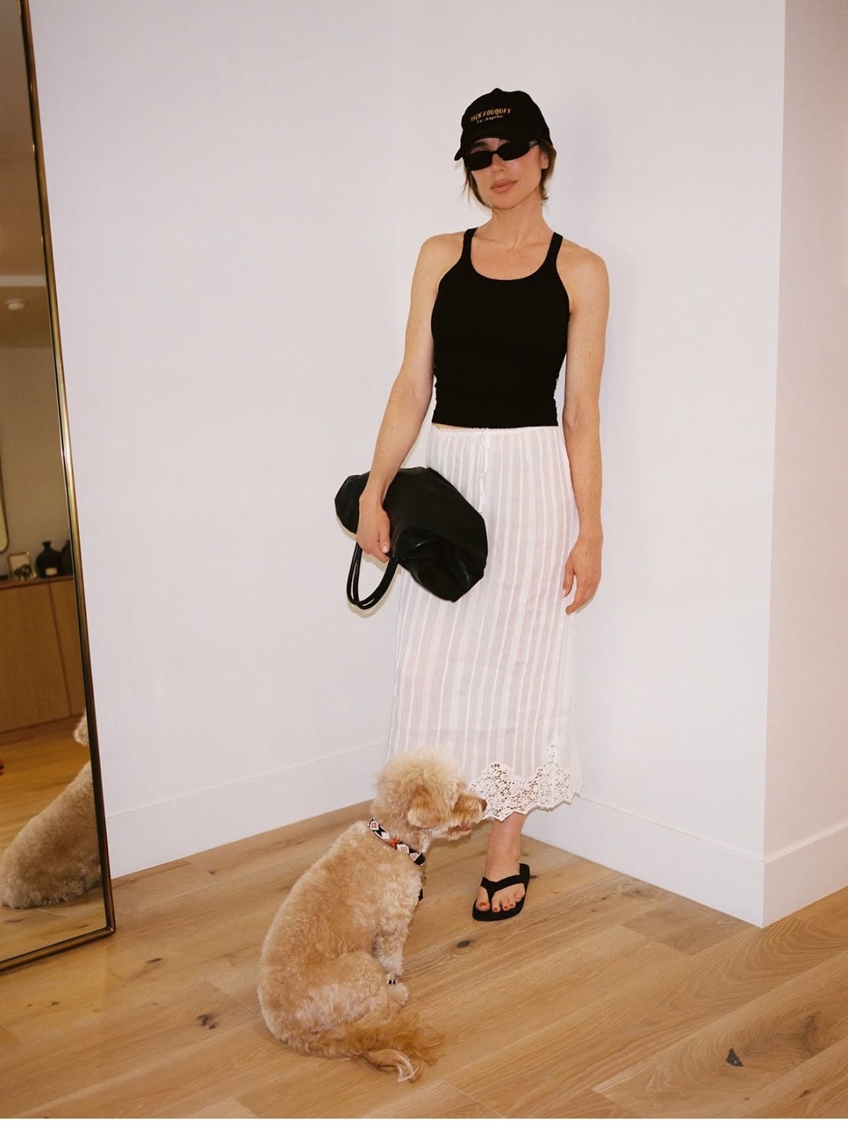I always re-purchase the Re/done tanks. I’m obsessed with the white and black ones. I’ve bought like five of them, and the cut is perfect; they don’t stretch out. You can never have too many white tanks, especially in summer! I wear them with a skirt, jeans, or slacks; they’re just the perfect essential in my closet.