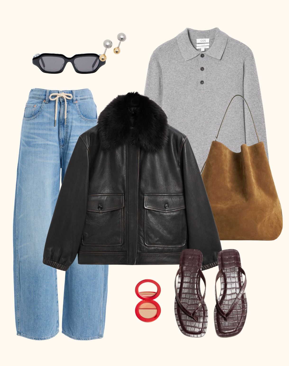 Loewe sunglasses // Banana Republic earrings // COS collared sweater // Toteme tote // Massimo Dutti leather jacket // DL 1961 jeans // Farah Homidi complexion compact // H&M flip flops