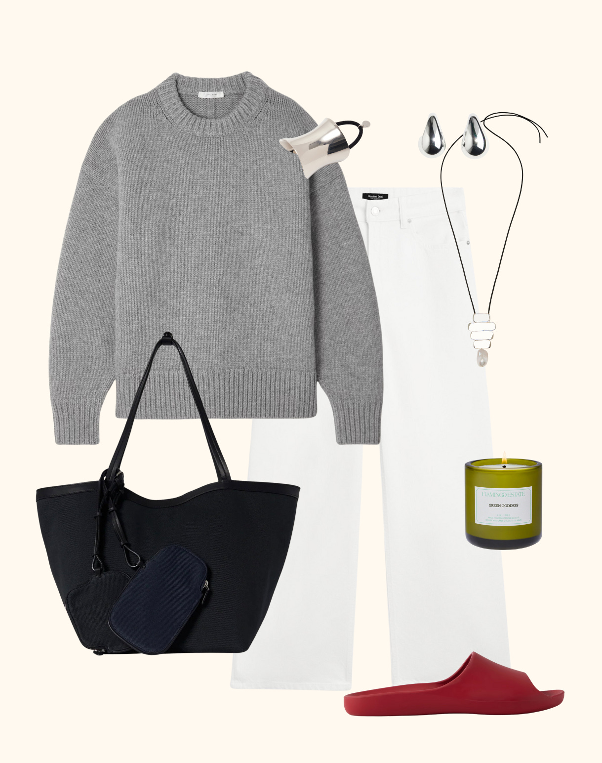 The Row sweater // Massimo Dutti jeans // LETLET NY ponytail cuff // H&M earrings // AGMES necklace // Flamingo Estate “Green Goddess” candle // The Row slides // The Row canvas tote
