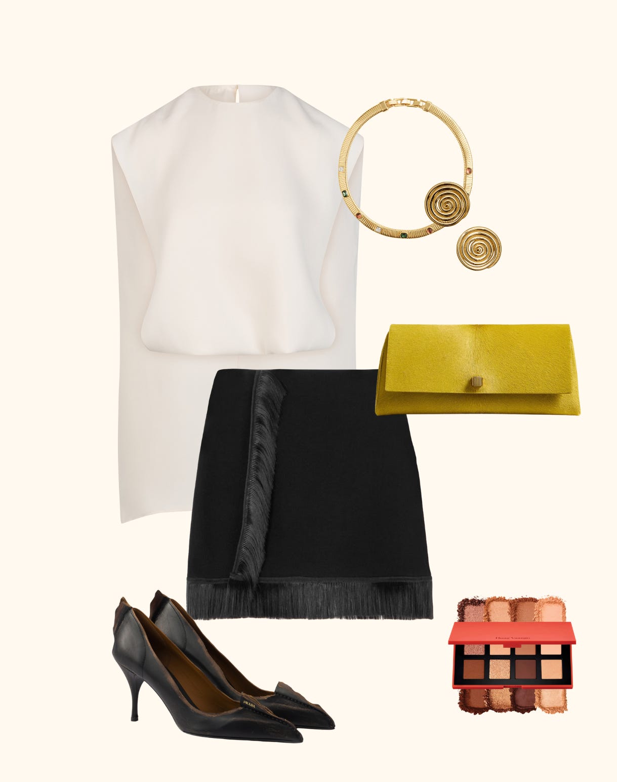 Heirlome top // J.Crew necklace // Anna Lui at Banana Republic earrings // Jil Sander skirt // Prada pumps /// Hung Vanngo eye pallette // Khaite clutch