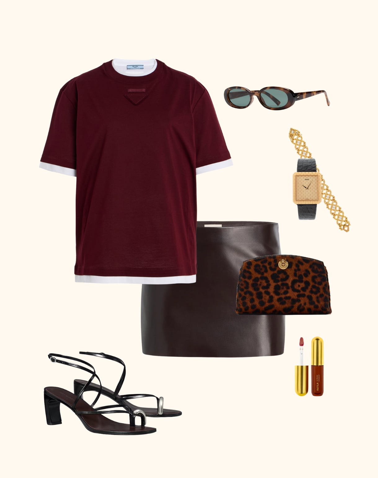 Prada t-shirt // Le Specs sunglasses // Stephen Russel vintage Tiffany bracelet // Stephanie Windsor Piaget vintage watch // Liffner clutch // Violette Lip Nectar // Khaite skirt // Tory Burch sandals