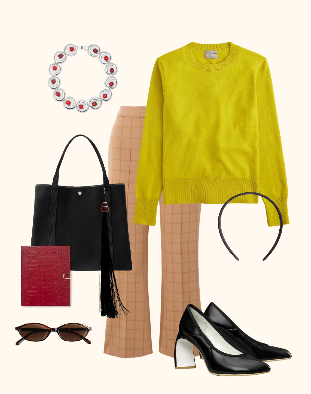 Juliette necklace // J.Crew sweater // High Sport Pants // H&M headband // Tory Burch pumps // H&M sunglassess // Smythson notebook // Rude de Verneuil tote styled with Kallmeyer tassel