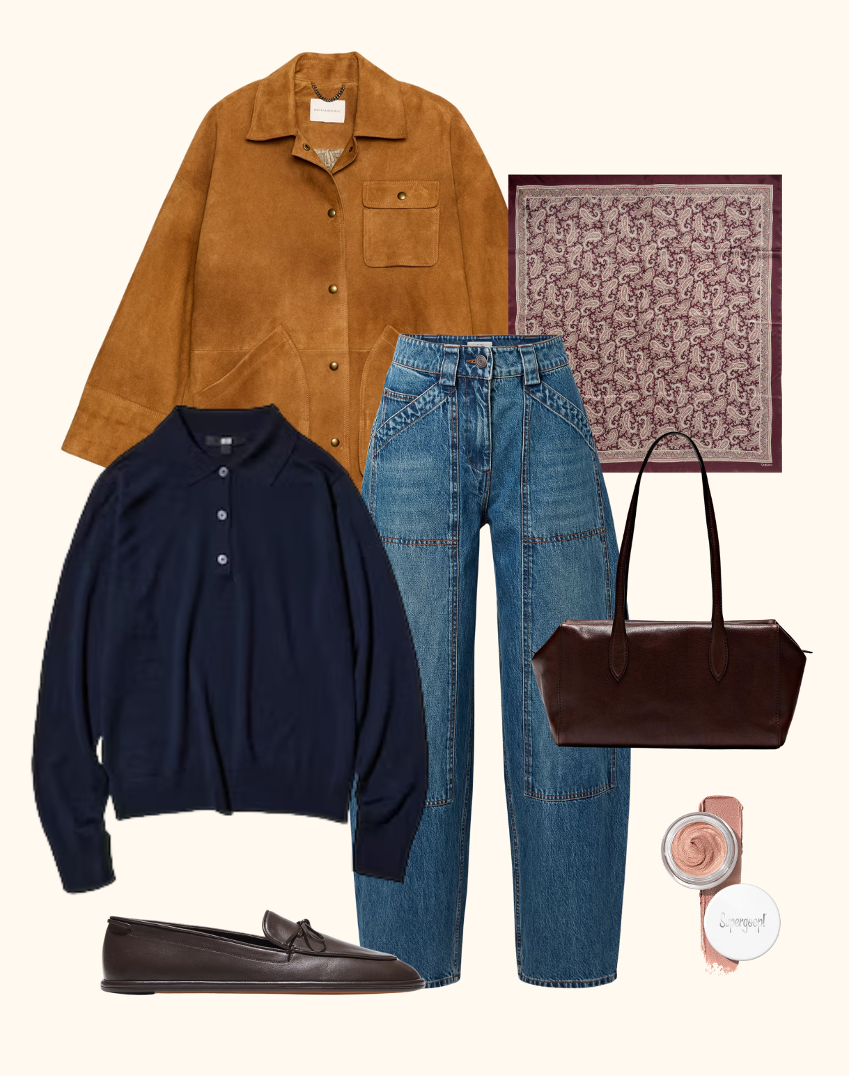 Banana Republic suede jacket // UNIQLO collared sweater // CO jeans // Massimo Dutti bag // Saint Laurent silk bandana // Supergoop Shimmershade SPF 30 // Emme Parsons loafers