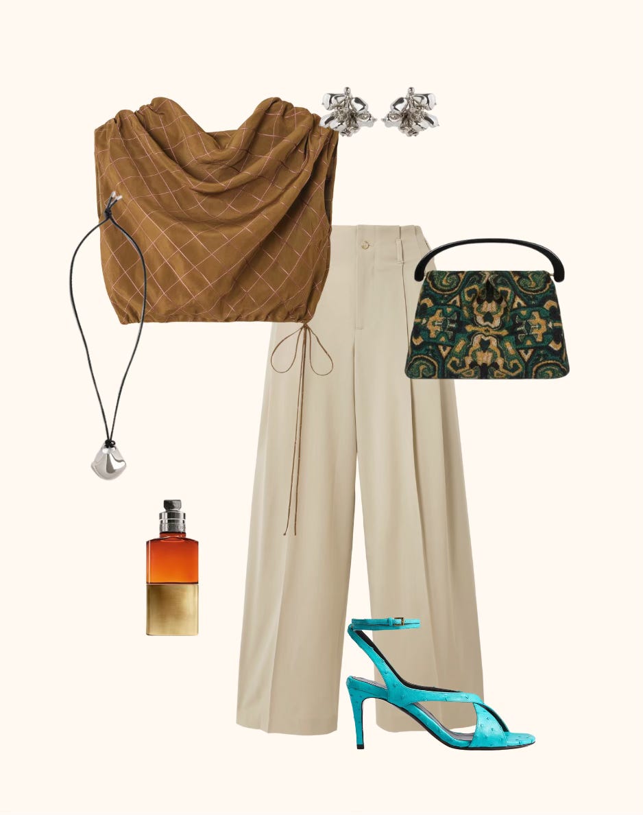» Kallmeyer top and trousers, Dries van Noten earrings, bag, perfume, Khaite sandals and necklace