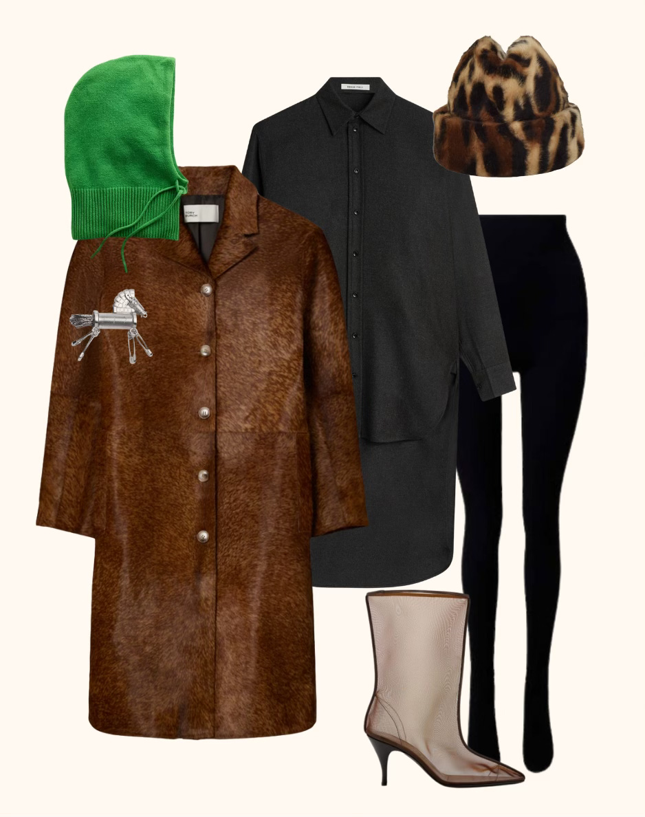» Gap cashsoft hood, Tory Burch coat, Phoebe Philo shirt, The Row tights, Herbert Levine boots, Gigi Burris hat, Dior brooch