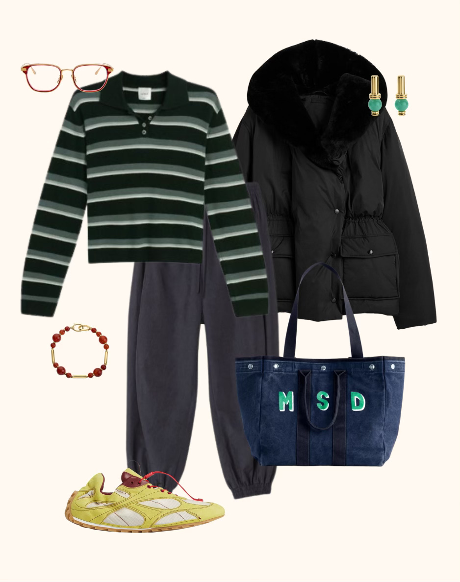 » Linda Farrow glasses, LeSet polo, Toteme puffer, Jade Ruzzo earrings and bracelet, CO joggers, Alex Mill tote, Bottega Veneta sneakers