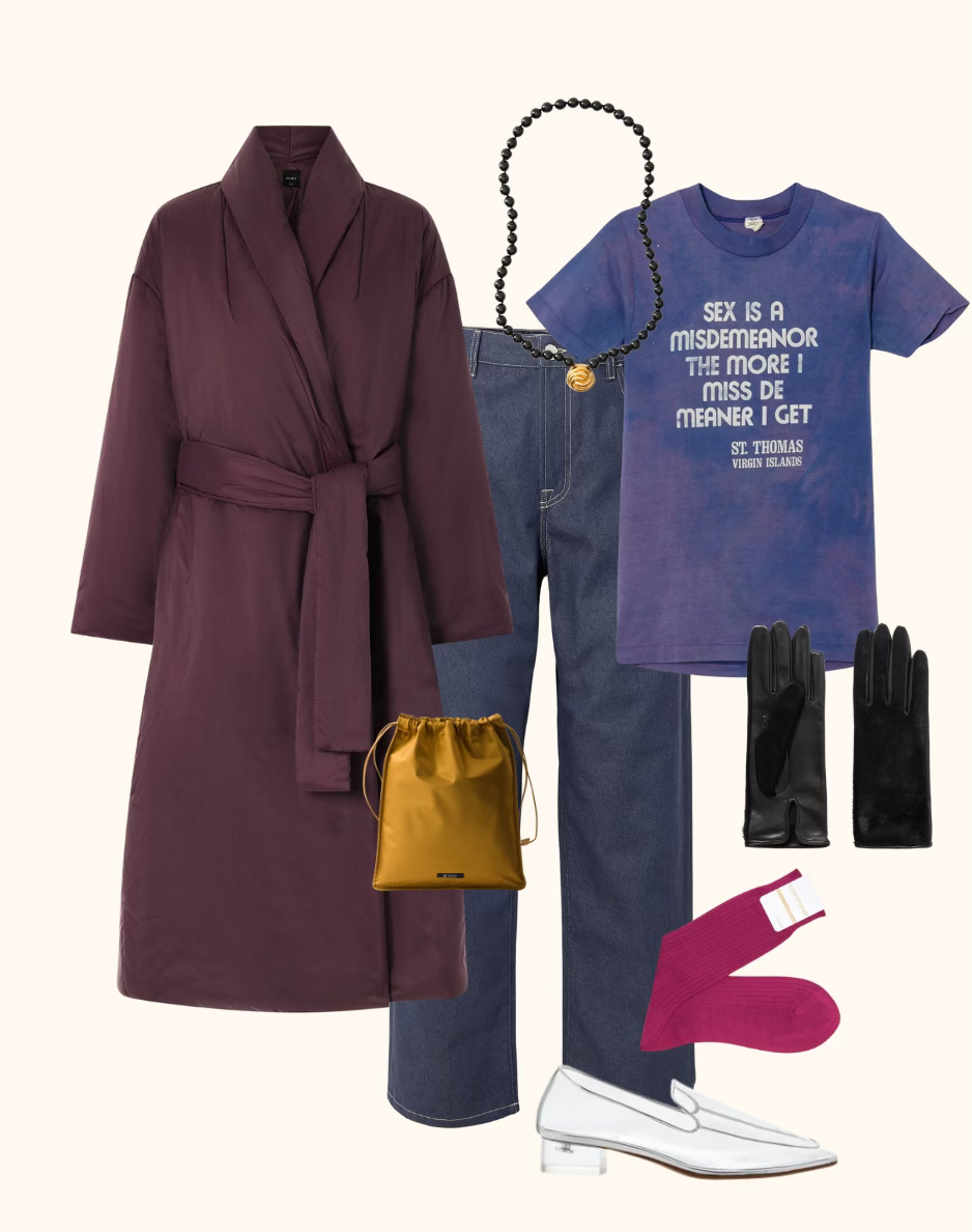 » LeSet coat, Julietta necklace, Re/Done vintage t-shirt, Prada pouch, Rohé jeans, Gammarelli socks, Herbert Levine loafers