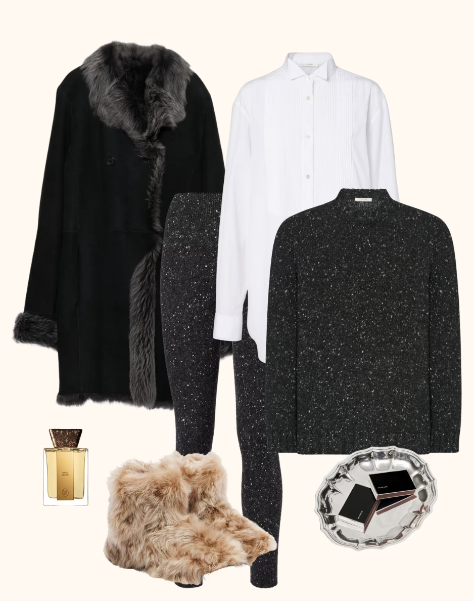» Vintage 1990s Romeo Gigli coat, The Row shirt, sweater, and leggings, CHRISTEN booties, Maison du Roc perfume