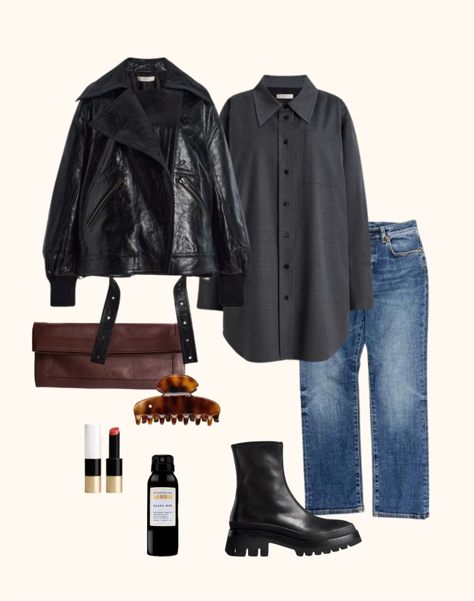 » CO jacket and wool shirt, 6397 jeans, Jamie Haller clutch, Sophie Buhai hair clip, Hermes lip balm, Pat McGrath Skin Fetish, Khaite boots