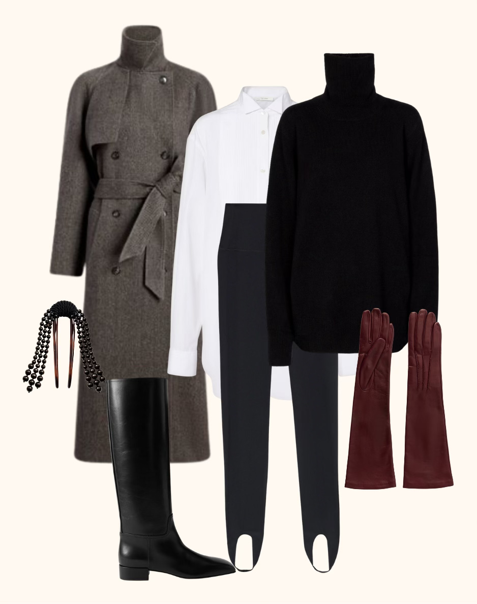 » Aflalo coat, The Row shirt and turtleneck, LeSet leggings, CHRISTEN boots, Nour Hammour gloves